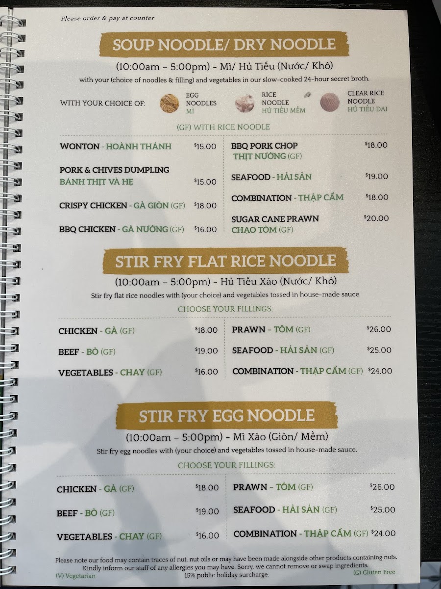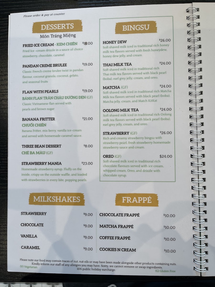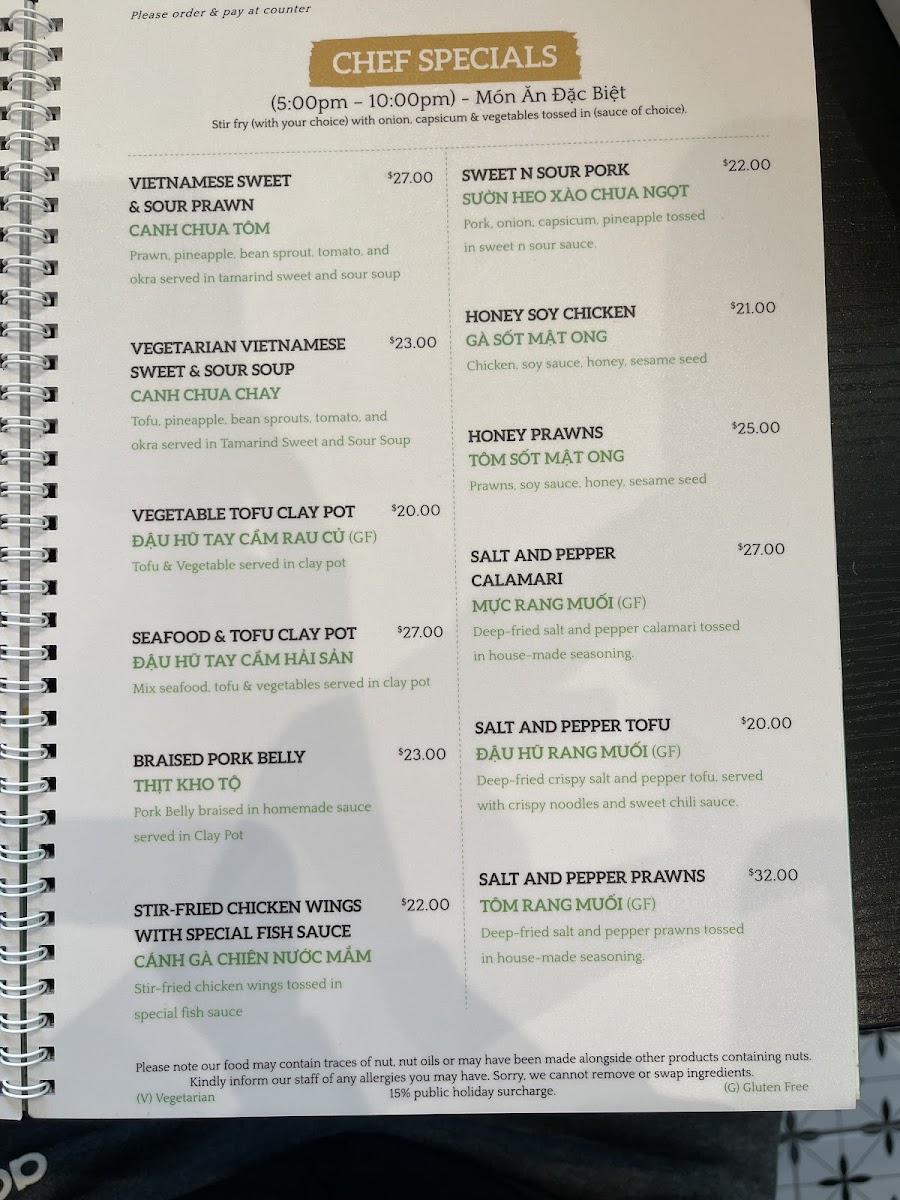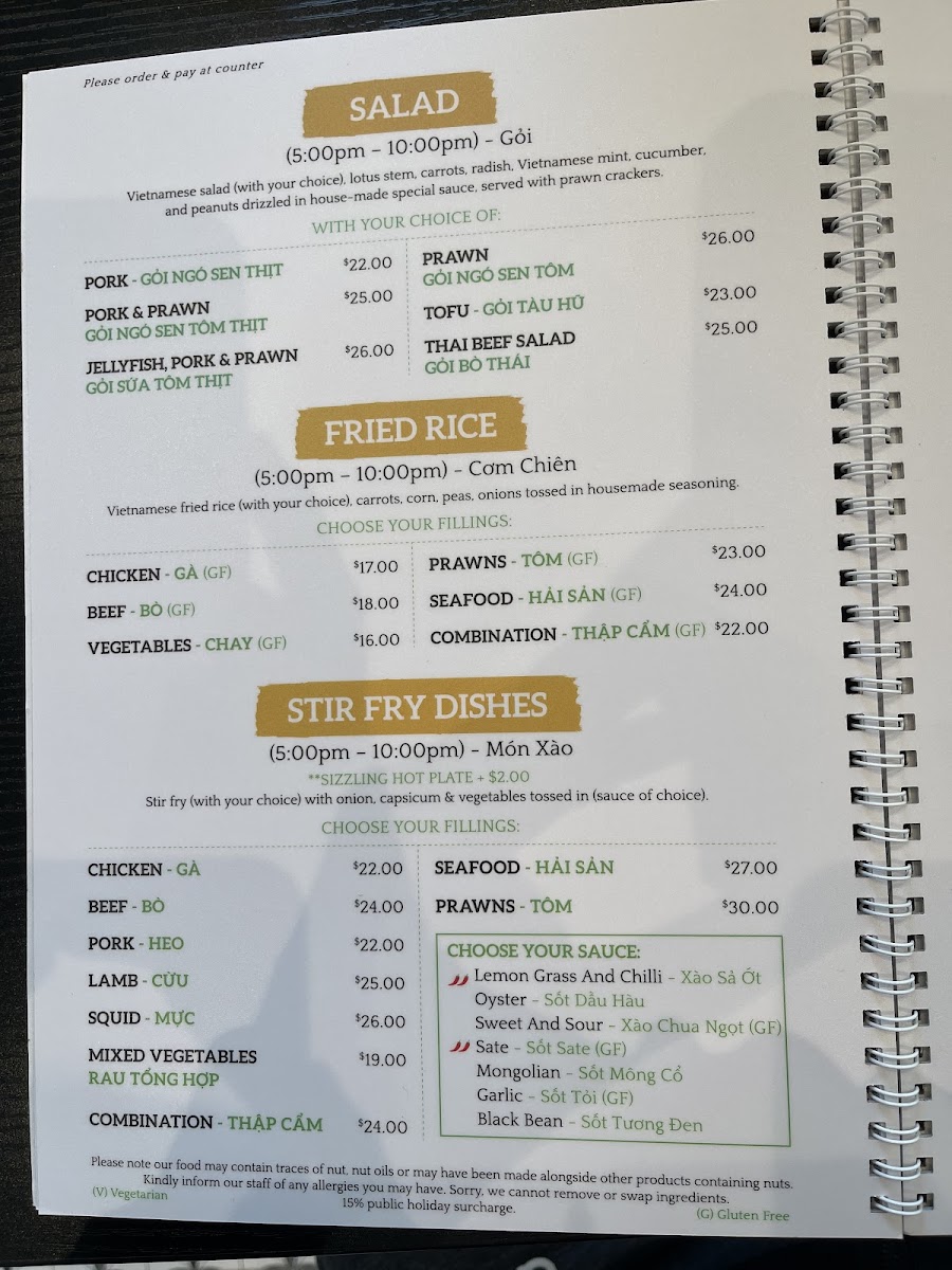 For seafood lovers, the Seafood Stir Fry Egg Noodle / Mì Xào Hải Sản combines tender egg noodles with an assortment of fresh seafood, expertly tossed in a savory sauce that leaves a lasting impression. It’s a symphony of textures and tastes that is certainly worth A$31.00. Not forgetting the Stir Fried Lemongrass With Chicken Vermicelli Sheet / Gà Xào Sả Ớt, a gluten-free offering that features vermicelli, juicy chicken pieces, crispy lettuce, and fresh herbs wrapped in delightful layers—perfect for an invigorating lunch!