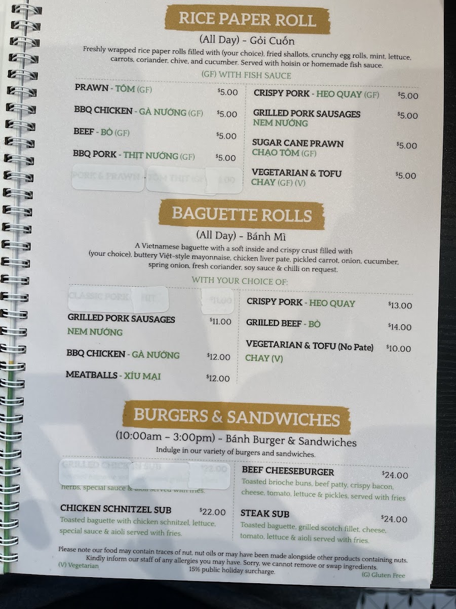 And if you're in the mood for something a bit more indulgent, the Grilled Pork Sausages Baguette Roll / Nem Nướng is a must-try. This crispy baguette is stuffed with fragrant grilled pork sausages, creamy Viet-style mayonnaise, and enriched with pickled vegetables—a delightful explosion of flavors for just A$13.20.